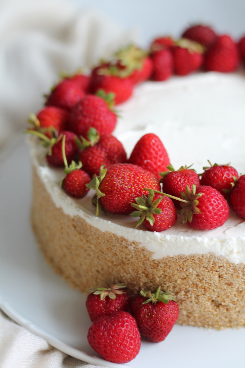 Vršek uhlaďte cukrářskou štěrkou nebo lžící. Omyté a okapané jahody zbavte stopek a sem tam zapíchněte do krému.